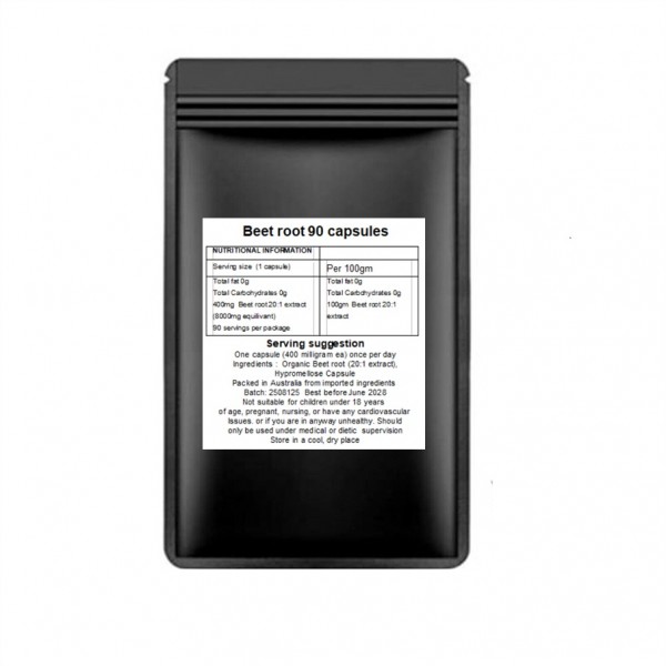 each capsule contains 400mg beetroot in a 20:1 extract (equilivant to 8000mg fresh beetroot), vegetable cellulose capsule